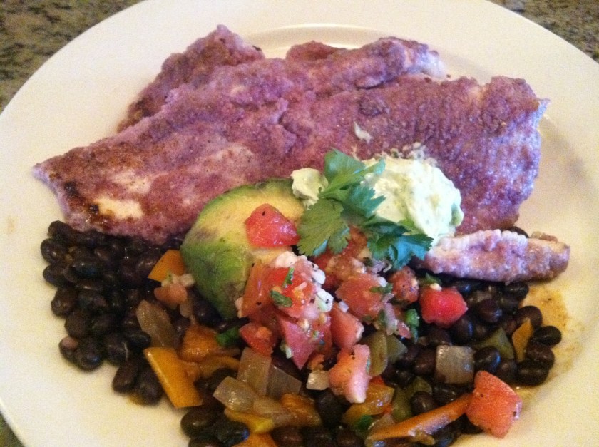 Blue corn-crusted local trout with black beans and cilantro creme fraiche.