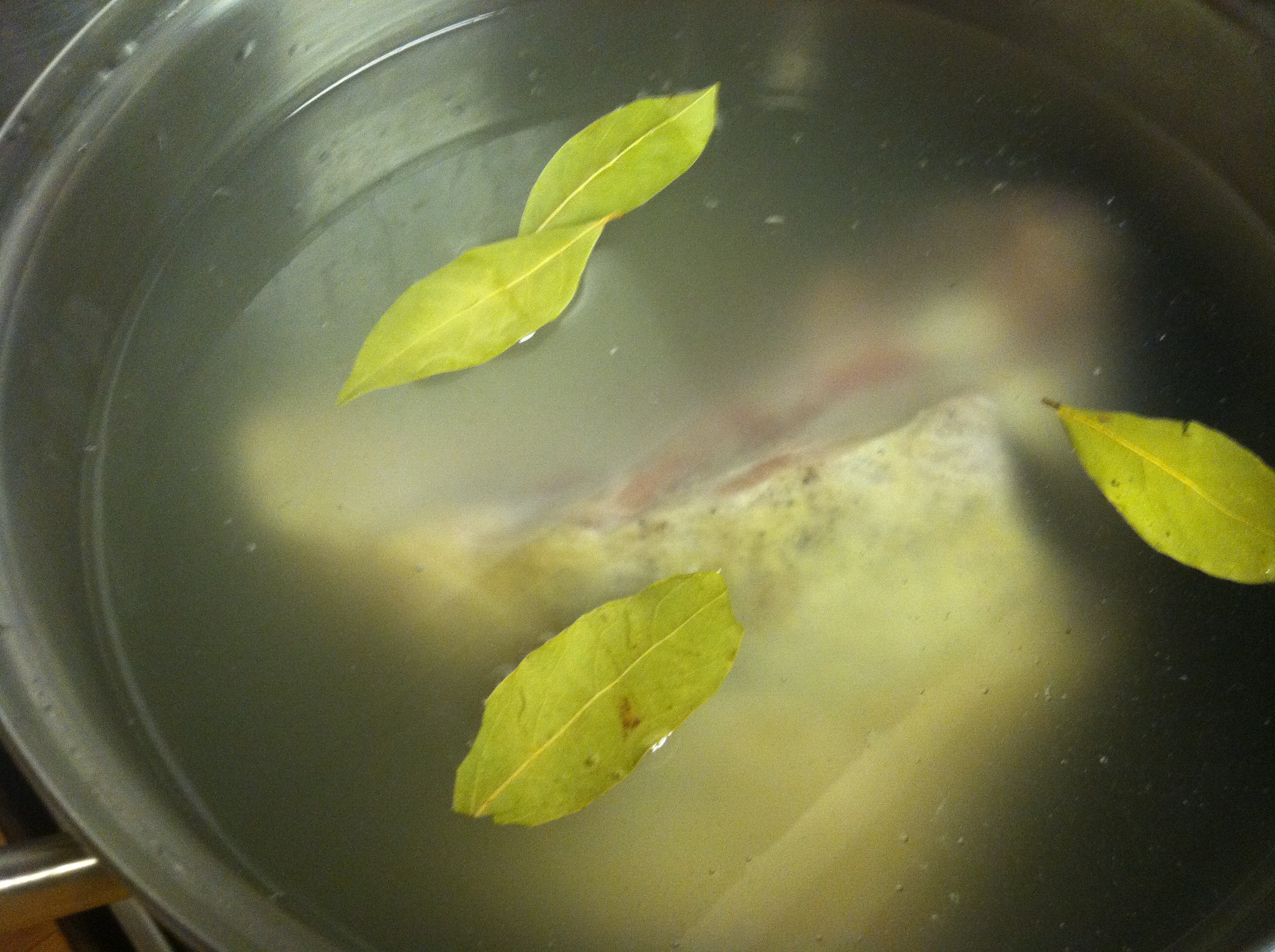 Put the ham in water to cover with the bay leaves and bring to a boil. Reduce to a simmer and let simmer for 2-3 hours,partially covered.