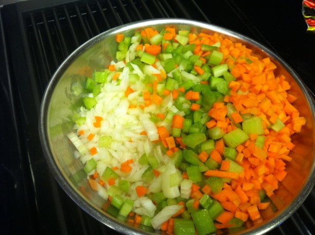 Brown the carrots, onions, and celery well in a separate pan. When well-browned, add the butter, garlic and sugar and allow to further cook and brown for another half hour. Take care that they do not scorch by reducing heat as necessary.