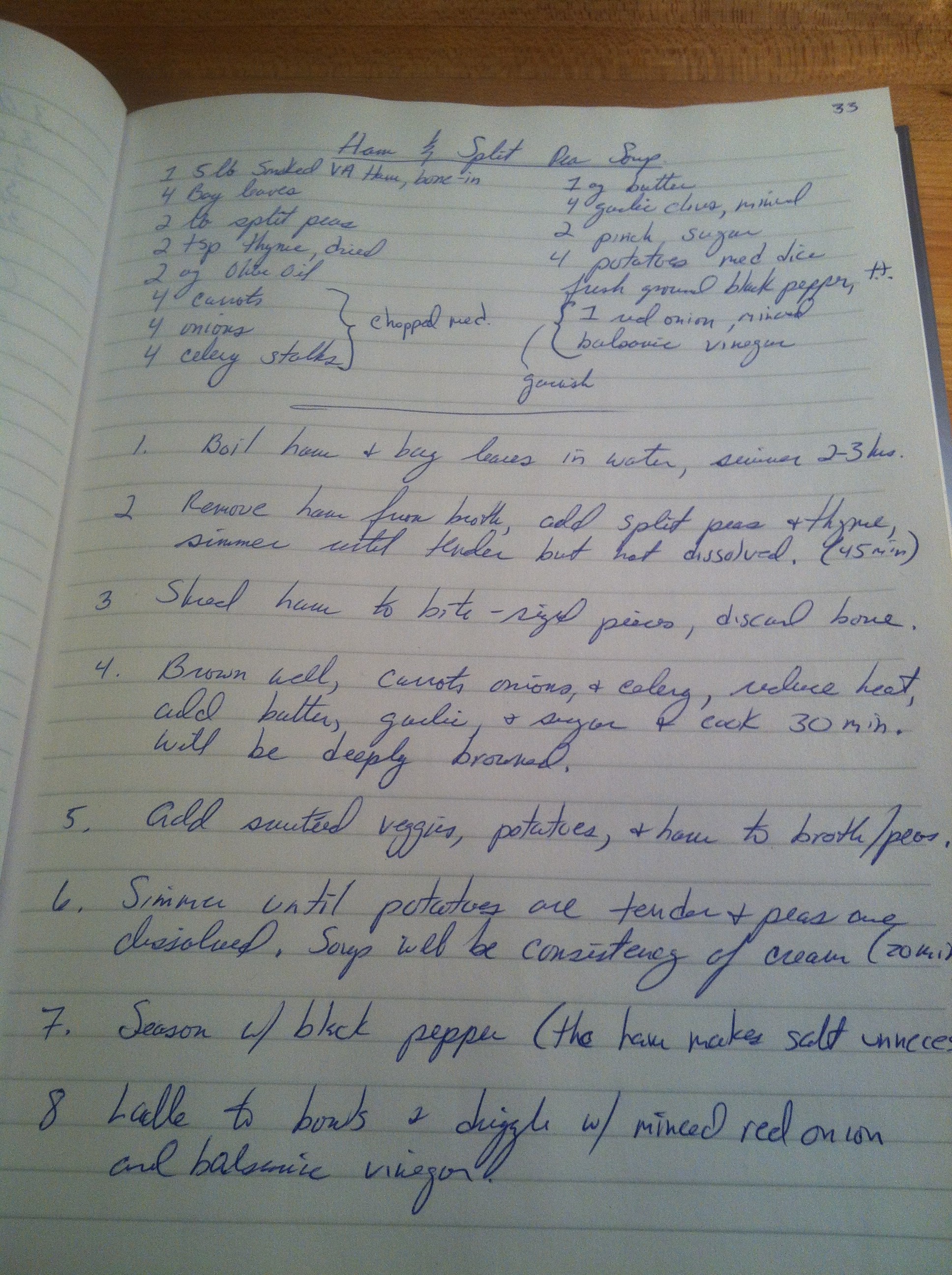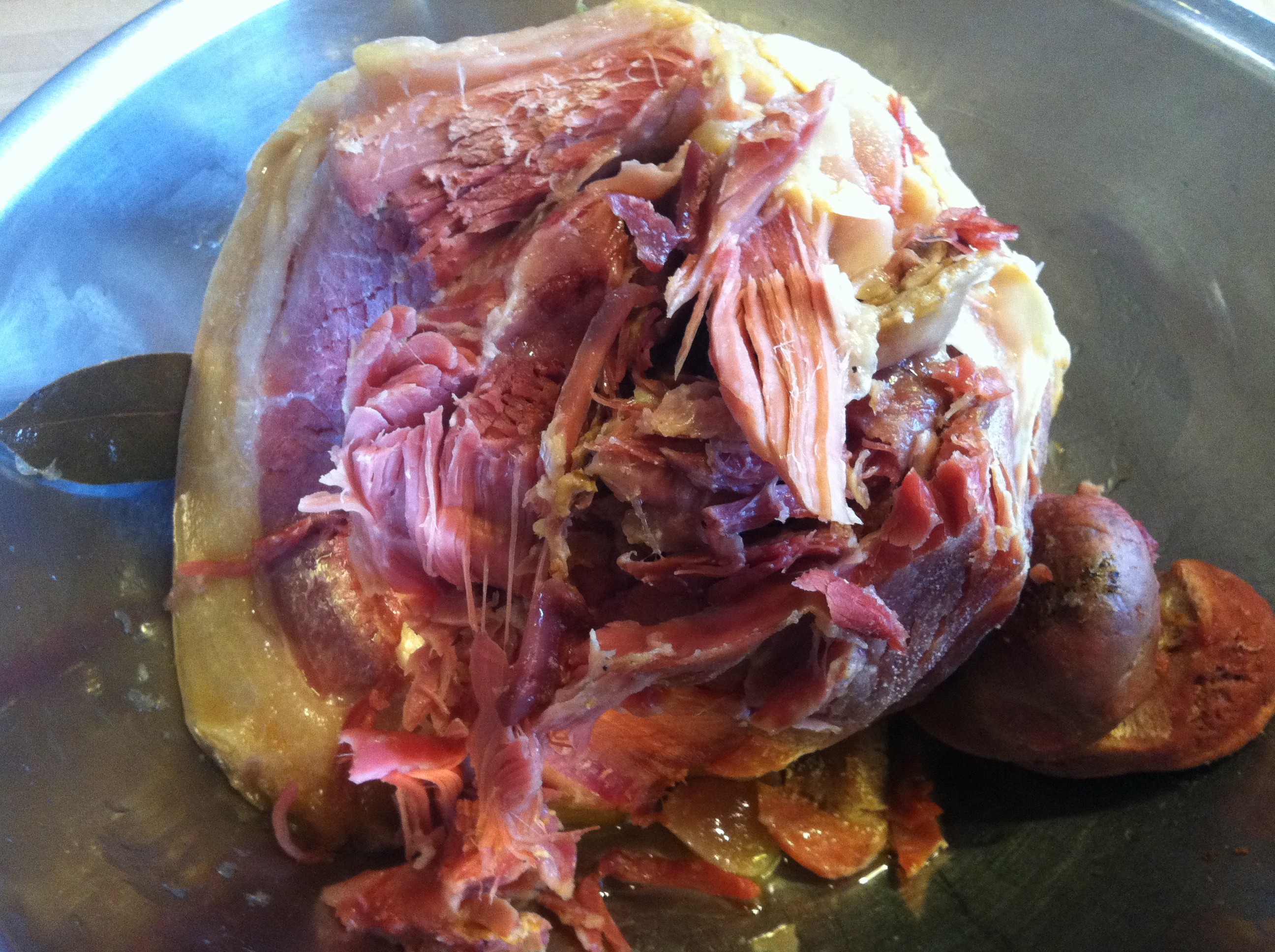 The basic ingredient is a VA smoked country ham. This is not the sterile tasteless rubbery ham of deli cold cuts. This is ham with real flavor. In this case you begin by cooking the whole ham in water with bay leaves and this begins the broth. Then you add beans, browned vegetables, and seasoning. The result is a satisfying soup that sticks to the ribs.