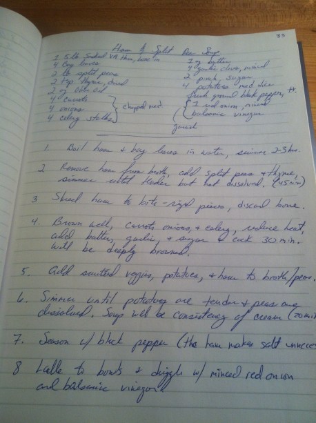 Remove the ham and add split peas and thyme to the broth. Simmer them until tender but not dissolved, around 45 minutes.