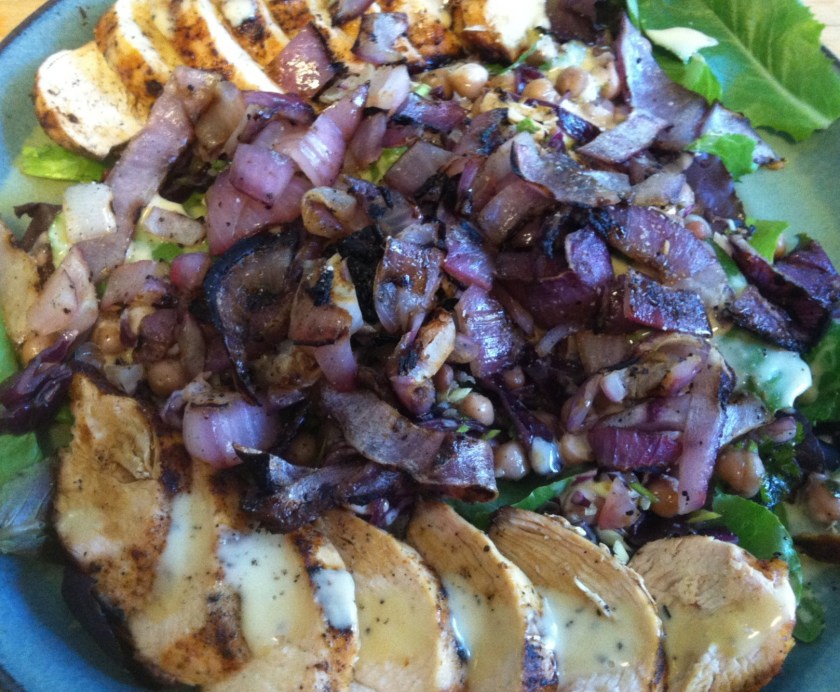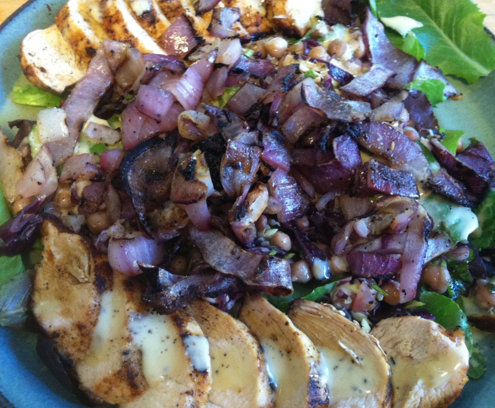 My own creation, grilled chicken breasts and Cajun grilled red onions on fresh baby romaine with a Caesar style dressing!