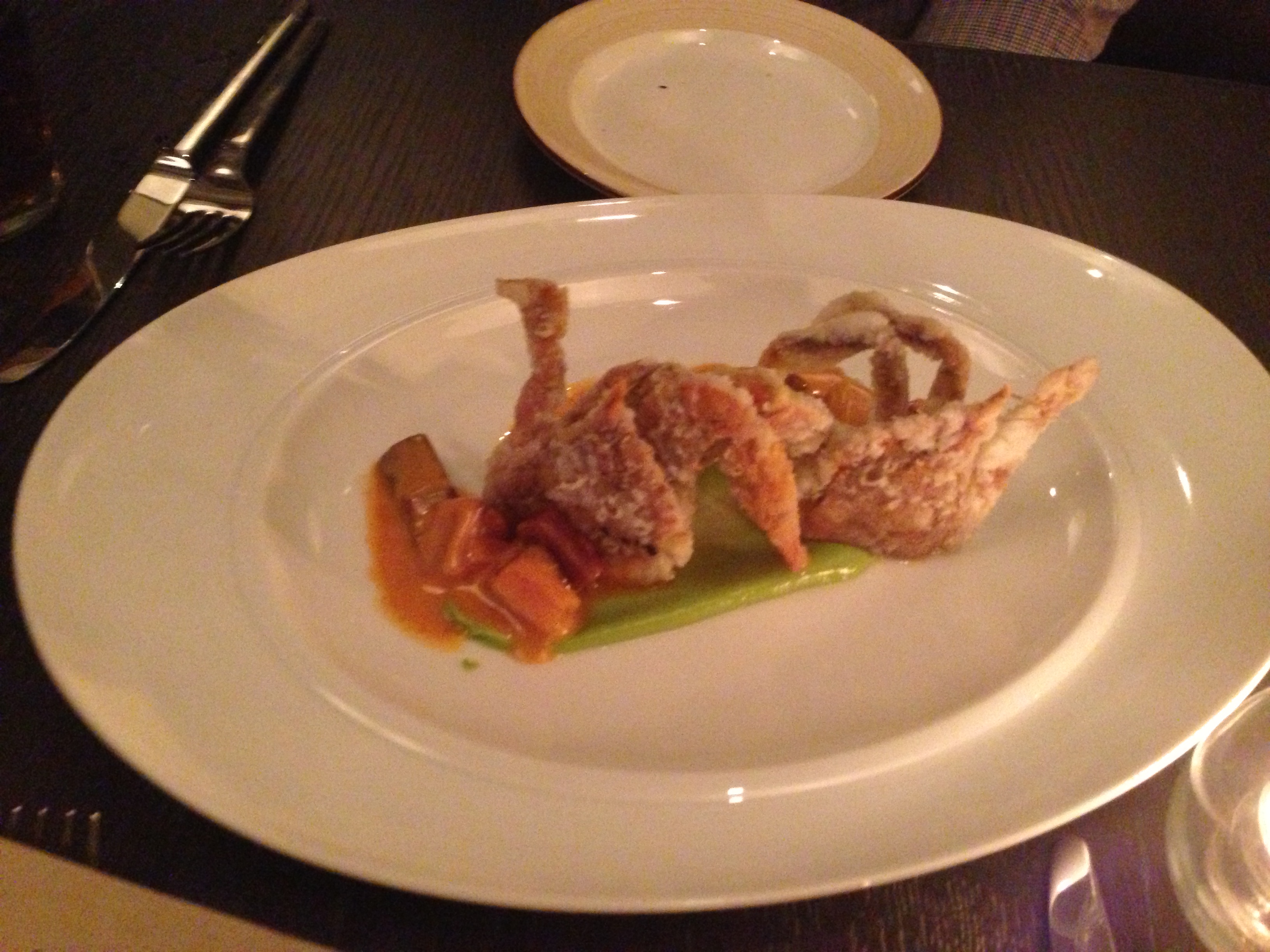 I have no doubt this will see the same level of success. The food was flawless. It is billed as an “American Brasserie” and is again, upscale, yet casual. Sitting in the posh bar area I felt like I was in a magazine ad! The menu and service were up to the challenge that the ambiance posed. We started off with a crispy soft-shell crab in an avocado puree. I wasn’t sure how that combination would work but there was also a slightly spicy sauce as well. The dish was as visually appealing as it was delicious!