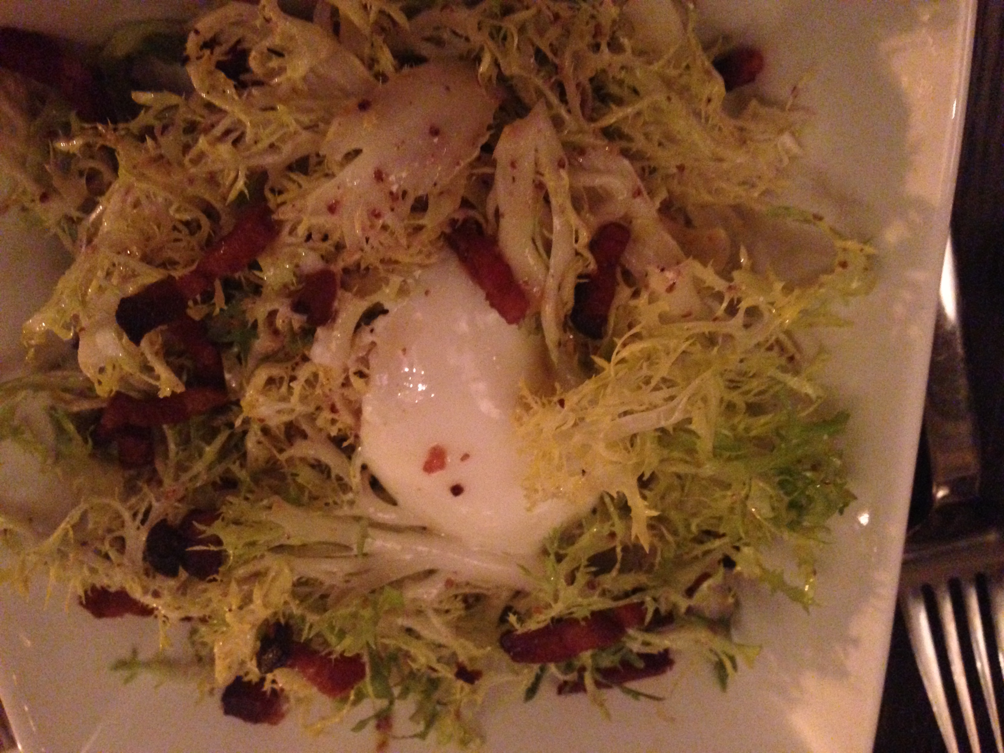 I followed the duck with a standby favorite of mine, not the biggest culinary challenge but the Frisée Salad with Poached Egg is such a decadent simple dish. As that yolk breaks open and blends with the dressing it becomes what I call the “poor man’s hollandaise”!