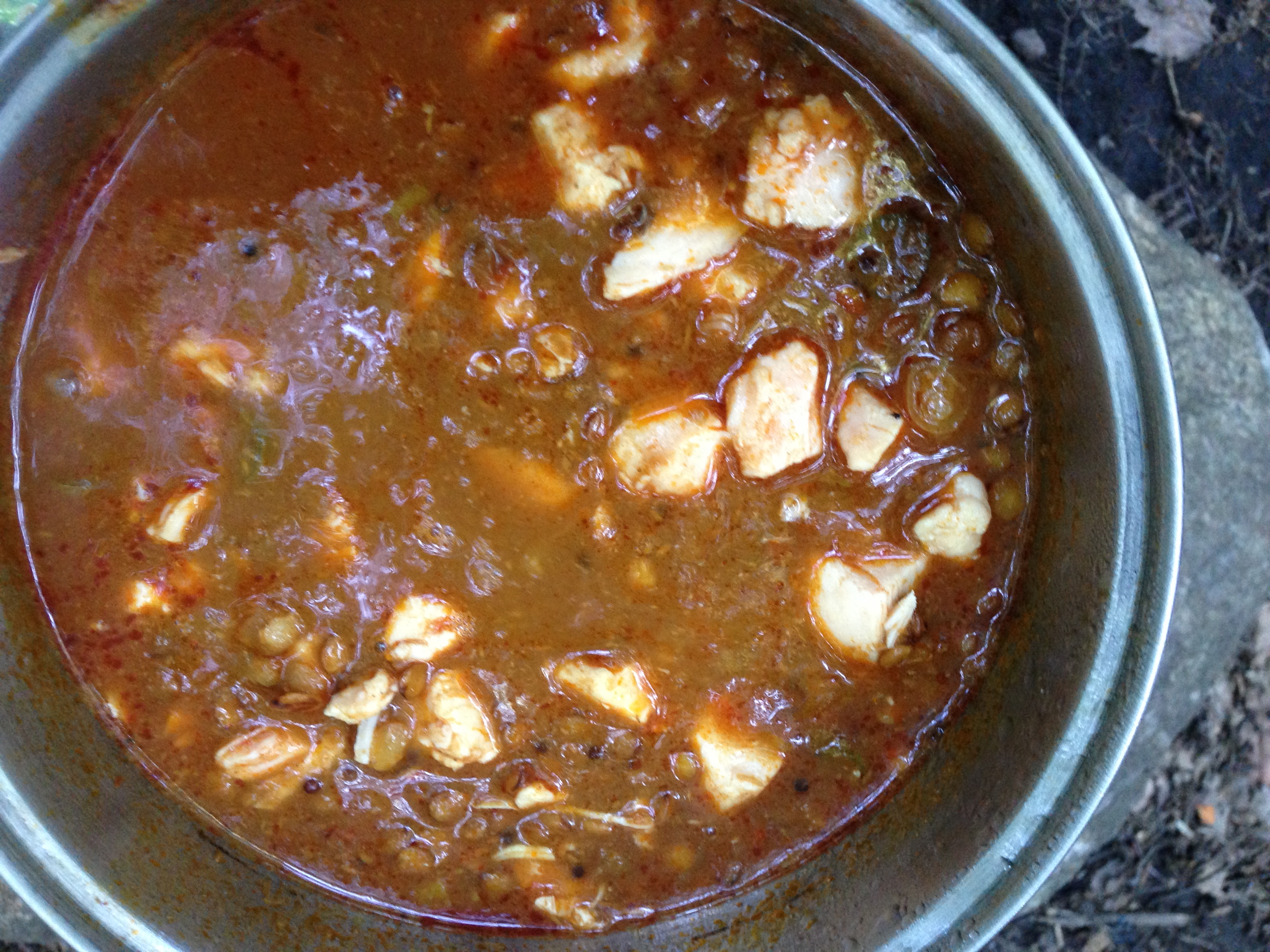 We got dinner going. As we hiked that day, we began discussing dinner early on. The decision was curried lentils with chicken. This would turn out to be the best meal of the week in my opinion. I cut up a scallion, a chili pepper, and a clove of garlic and sautéed them in oil before adding the lentils and the sauce mix. To that I added water and simmered while we bathed in the stream and washed our clothes. The foil pouch of chicken was already cooked and got added at the very end.