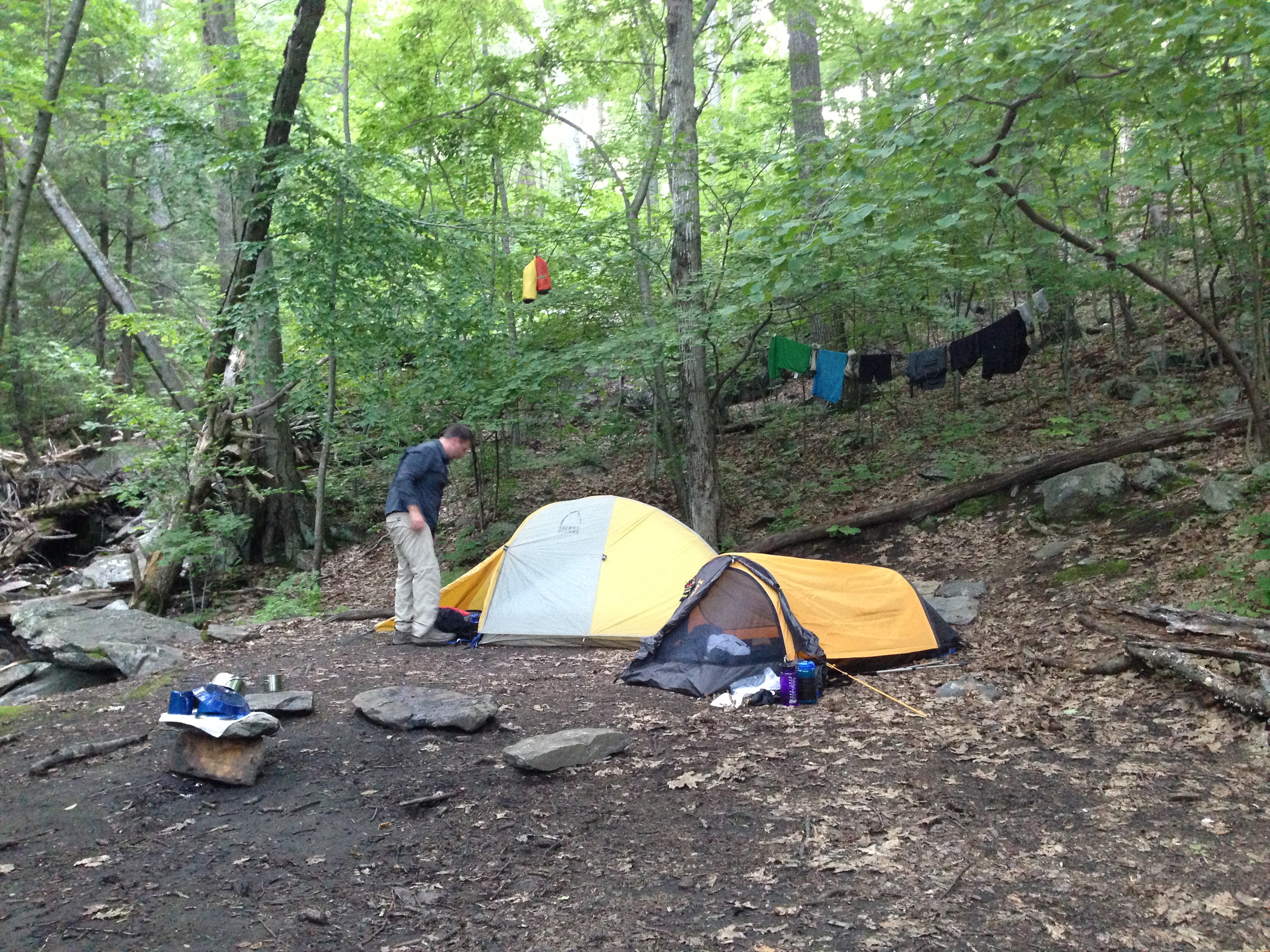 We opted for tents in the campsite and probably would have done that anyway due to the bugs. We began our routine, set up tents, get dinner started, get water from the brook, clean up, get organized, enjoy a quick bourbon toast and eat.