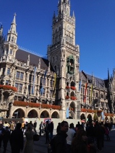 As you pass through the gates, you enter Marienplatz.  If Karlsplatz/Stachus feels very European, Marienplatz feels like you’re actually in a fairy tale.  It is a pedestrian only town square with cafes, performers, food vendors, and magnificent architecture.  The center piece is the Glockenspiel which a couple of times a day comes out of the tower with dancing figures as a sort of mega-cuckoo-clock.