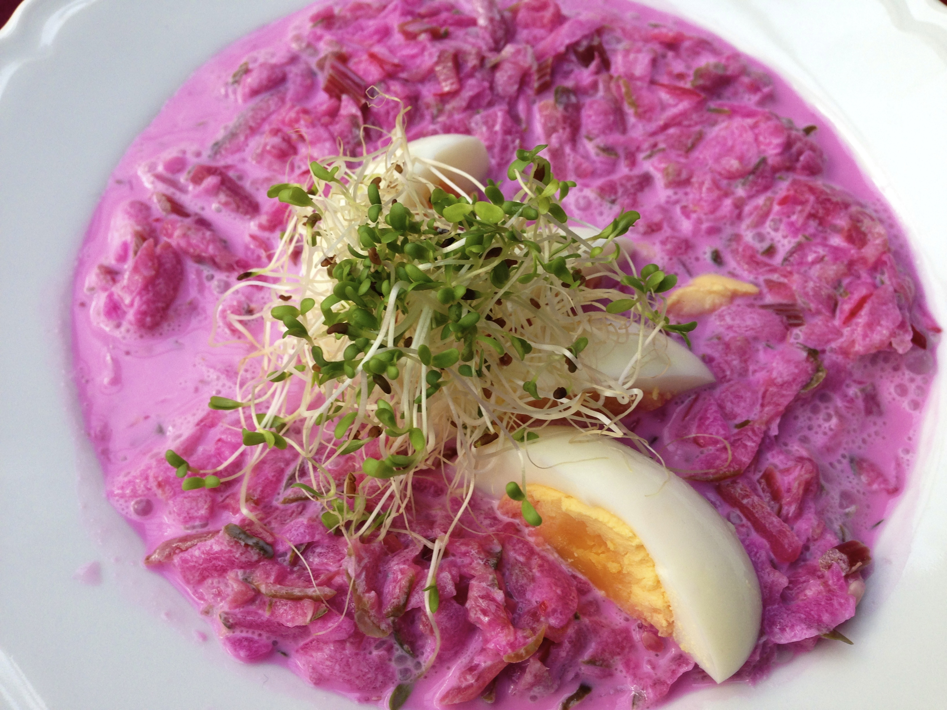 For some reason, maybe from watching too much Hogan’s Heroes, I always thought borscht was some sort of gruel from the Russian Front.  It is a fantastic cold soup made from beets.  The beets are chopped, cooked with their greens, and then flavored with sour cream.  They add chopped hard boiled eggs, and some raw vegetables such as radishes.  The result is refreshing and beautiful to the eye.