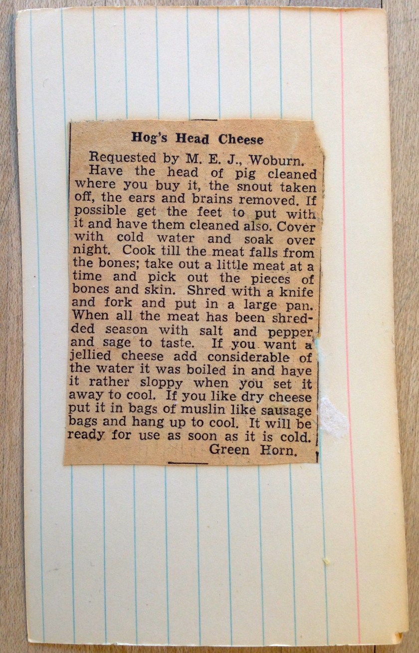 What really surprises me is that someone from Woburn, MA with the initials “M.E.J” actually wrote in to the paper asking for this recipe! Did they say, “I’ve got a hog’s head and I don’t know what to do with it?”
