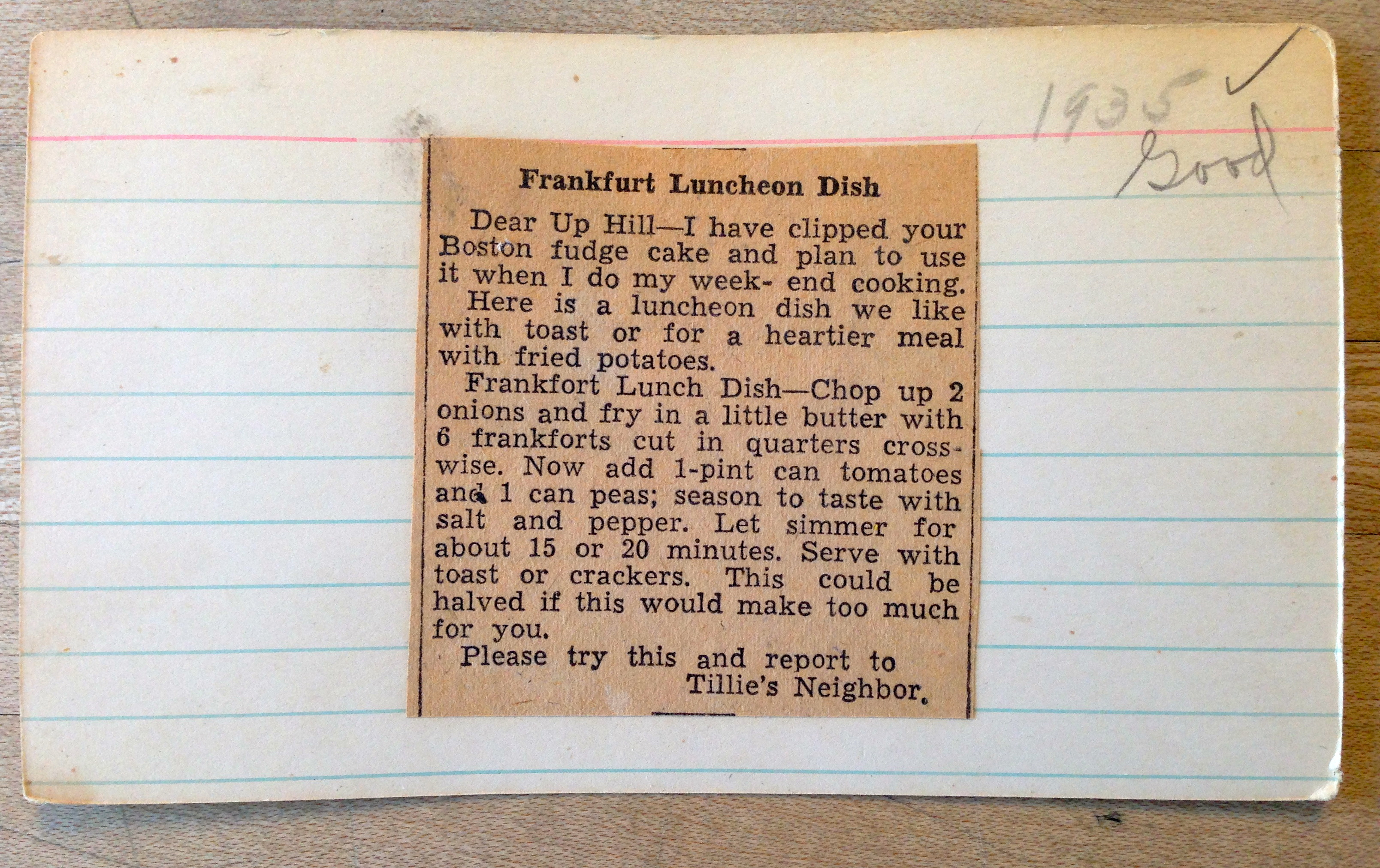 I can only hope that this is more reflective of the Great Depression than it is of the culinary state of the union in 1935. Apparently my grandmother tried it and like it, actually making a note that it was “good”. Hot dogs with fried onions, canned tomatoes and peas does not a “Frankfurt Luncheon Dish” make.