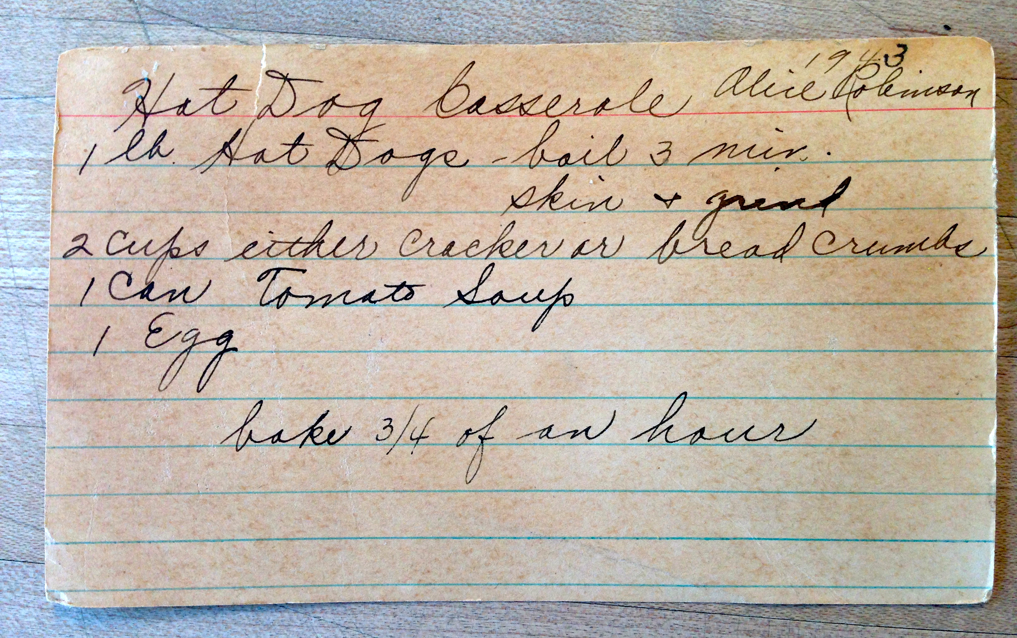 This one calls for boiling hot dogs, then skinning and grinding them! You couldn’t already get ground hot dogs in a can in 1943? Isn’t that what “Deviled Ham” was? This got mixed with cracker crumbs, tomato soup, and an egg and baked for an hour. An HOUR! I’m half inclined to make this just to see how it comes out. It seems like an hour in the oven would turn it into some sort of adobe block.