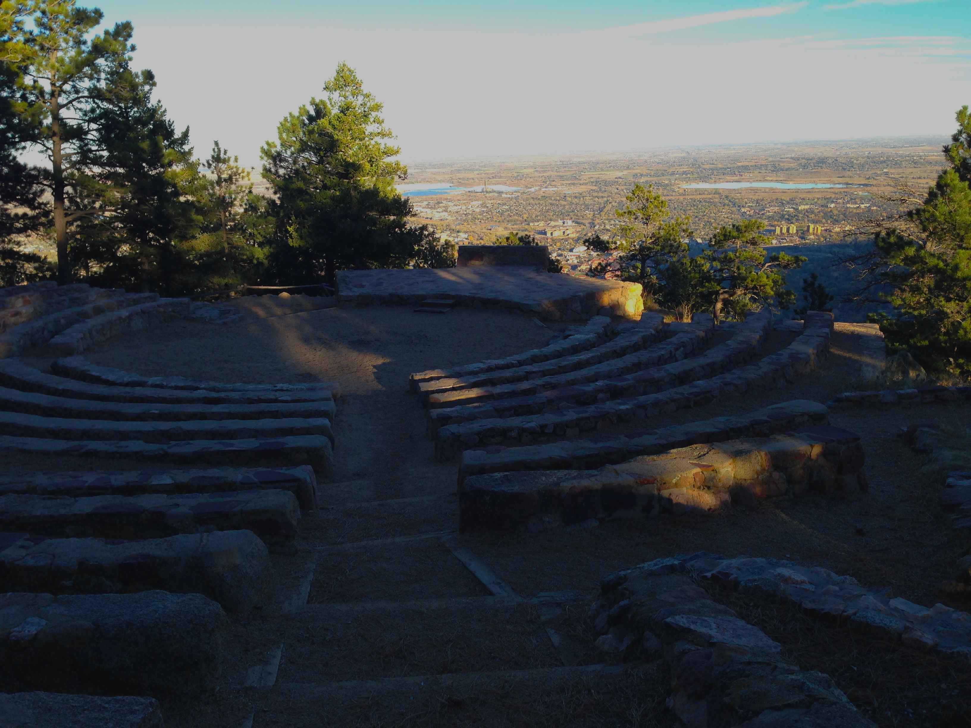 On the day we visited, we hiked a couple trails that led us to views in various directions. To the west was a sea of endless peaks, colors, and textures. I looked out and wondered how settlers thought they could ever cross this range. From this view it would have seemed impossible. To the east we discovered a charming outdoor amphitheater that overlooked Boulder and in the distance, Denver. I later learned that a colleague in my office had been married in this amphitheater.