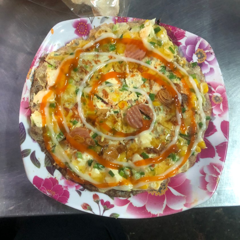 The Vietnamese name for our next food is Bánh tráng nướng. Our guides called it “Vietnamese Pizza”, and you can see why; but, it’s a misleading title, only because it bears no resemblance in flavor or texture to classic Italian pizza.