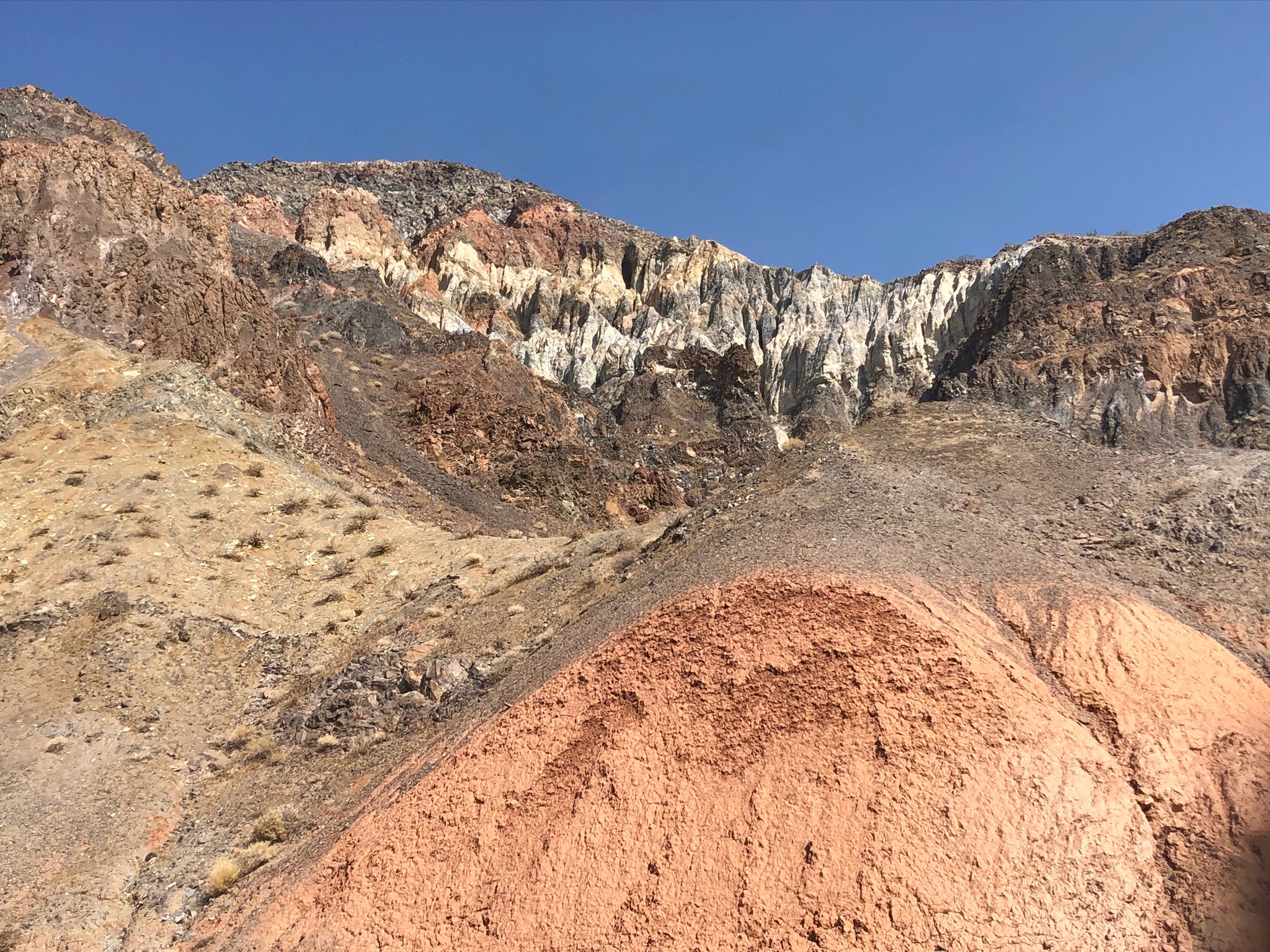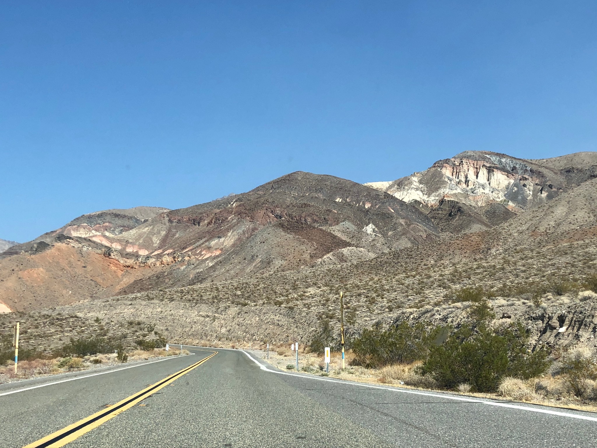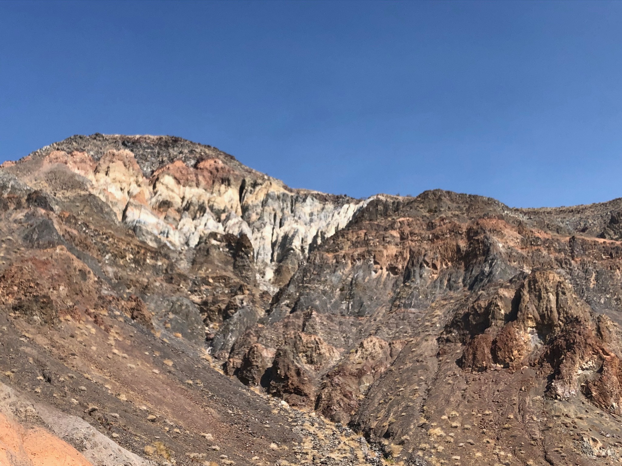 By early afternoon we were entering Death Valley National Park with its other-worldy landscape. we saw Rainbow Canyon known as “Star Wars” Canyon because of the US Air Force fighter pilot training maneuvers right through the canyon. The geological aspects were spectacular with layers of colors and textures. I was reminded of Simon Winchester’s The Map that Changed the World. I was a little disappointed that we didn’t see the searing heat Death Valley is known for. It was a dry 94 degrees and actually pretty pleasant!