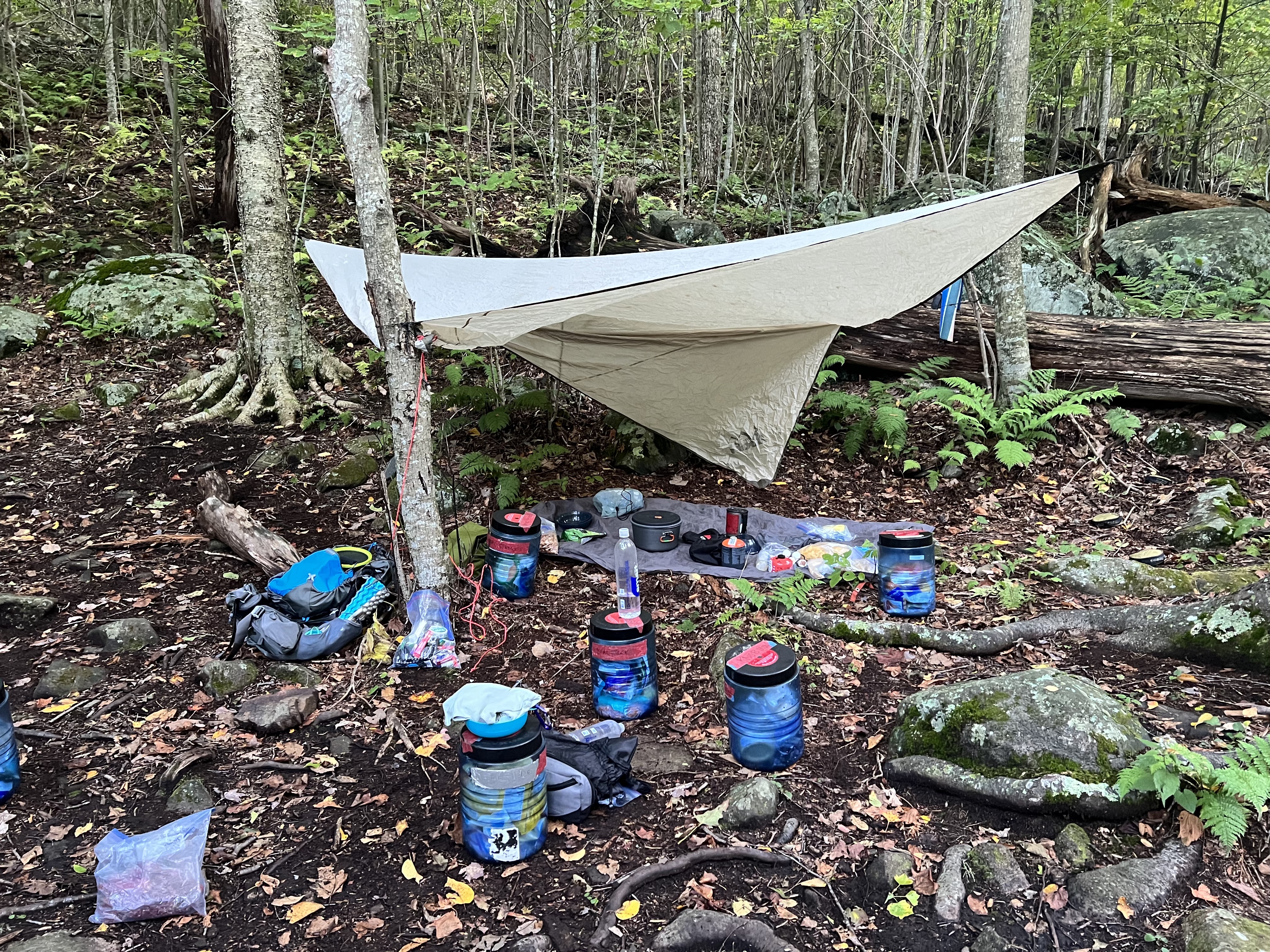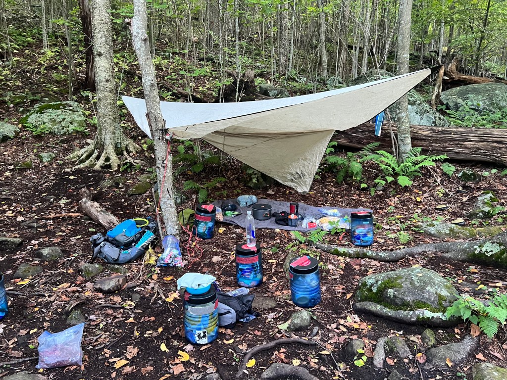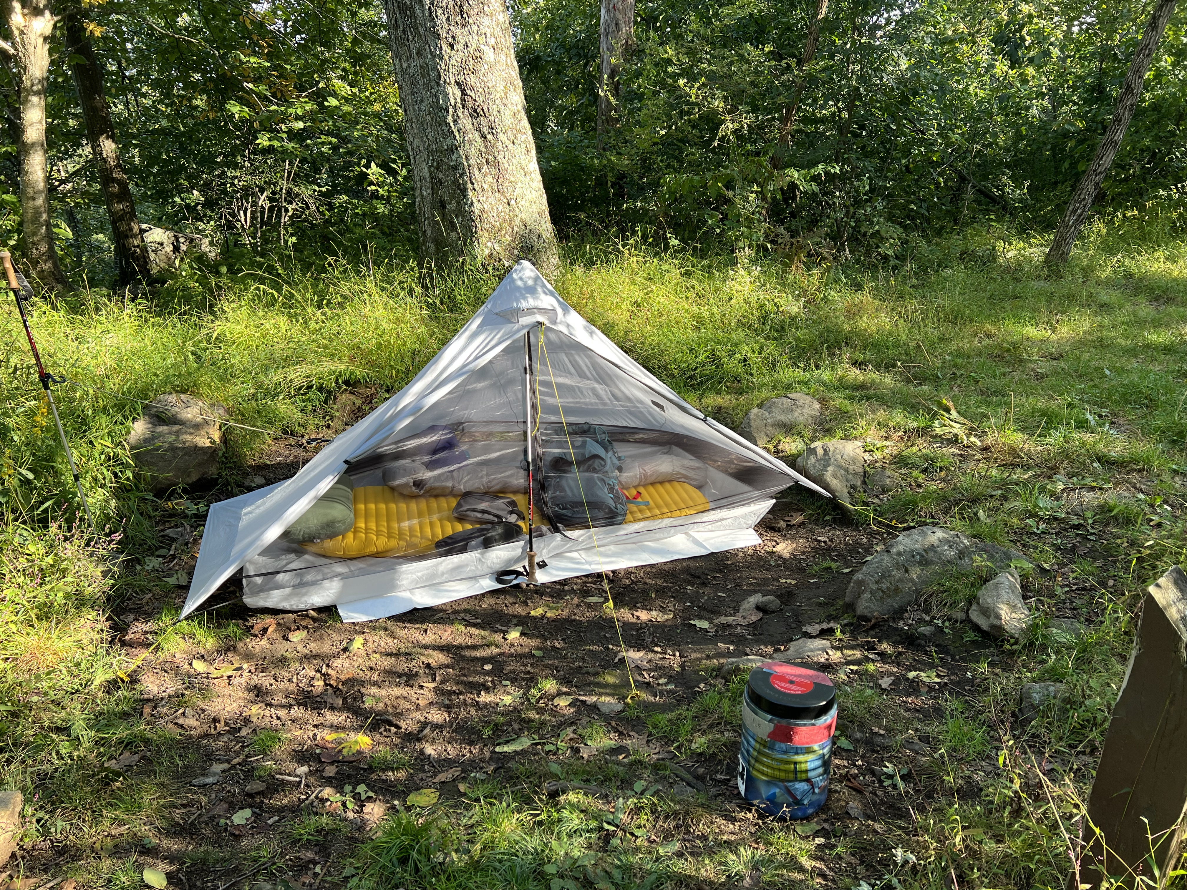My upgraded gear included a lightweight tent that used my trekking pole as the tentpole. Inside are an inflatable sleep pad, pillow, and down sleeping bag. Foreground is the bear canister.