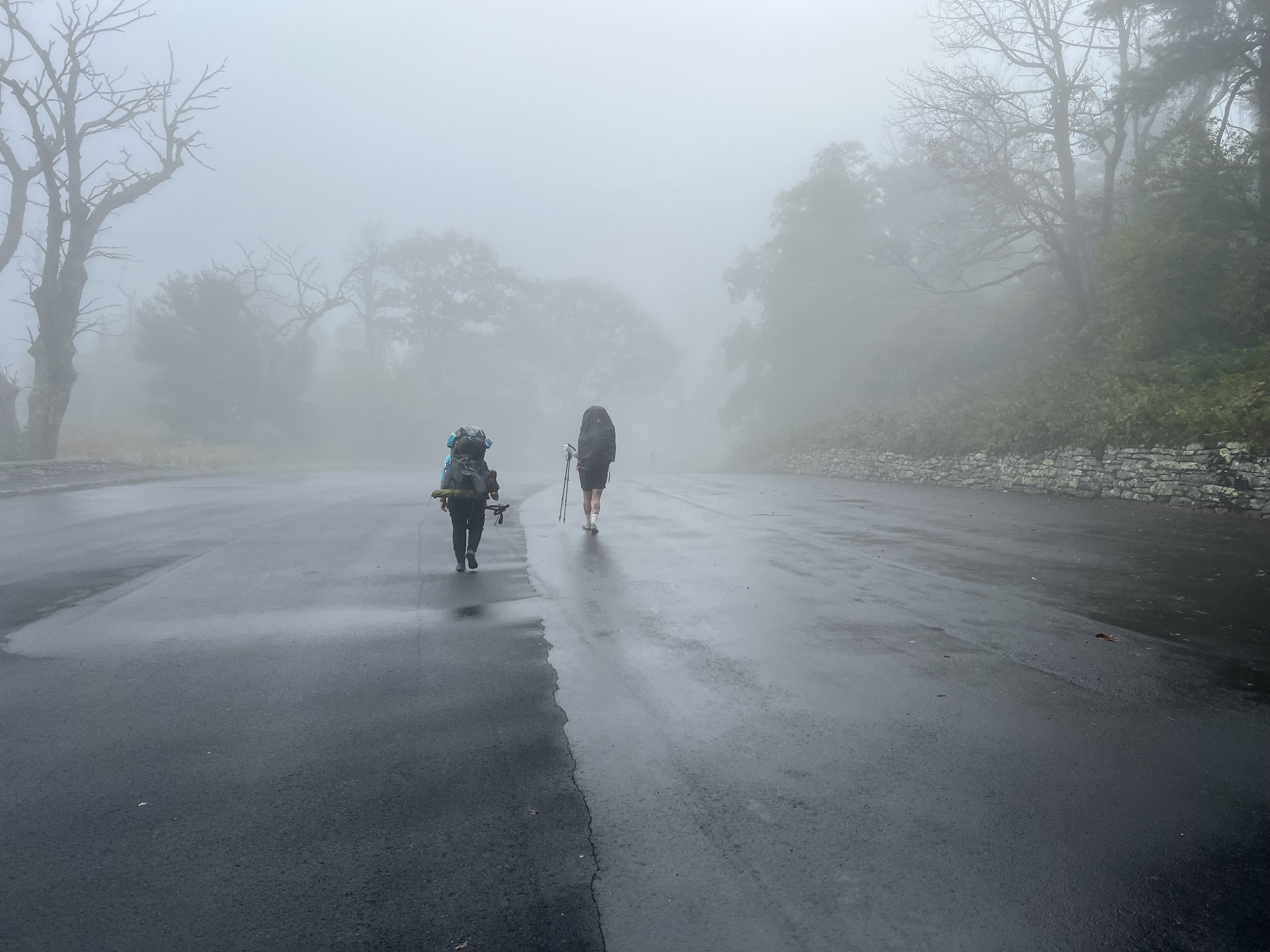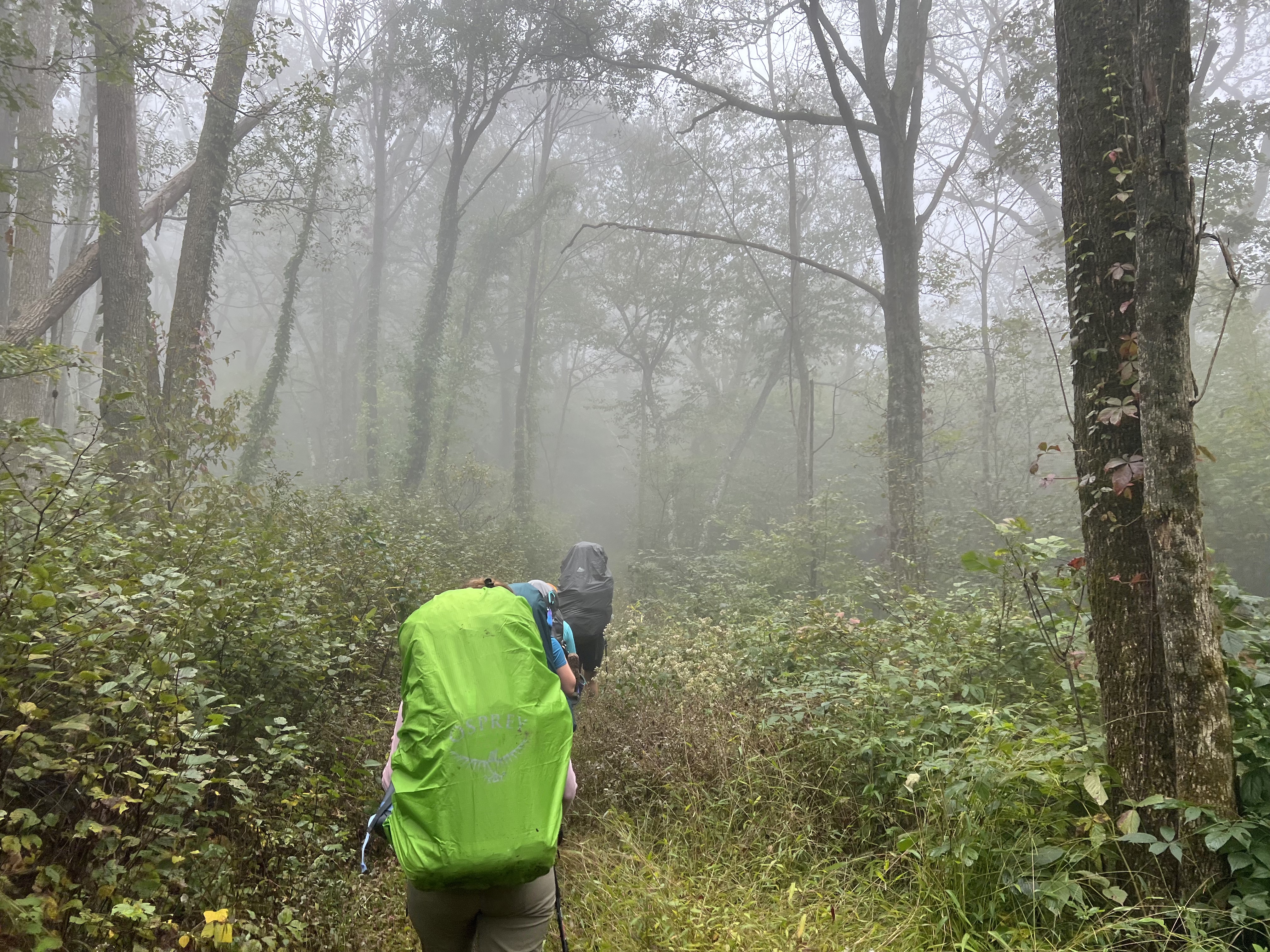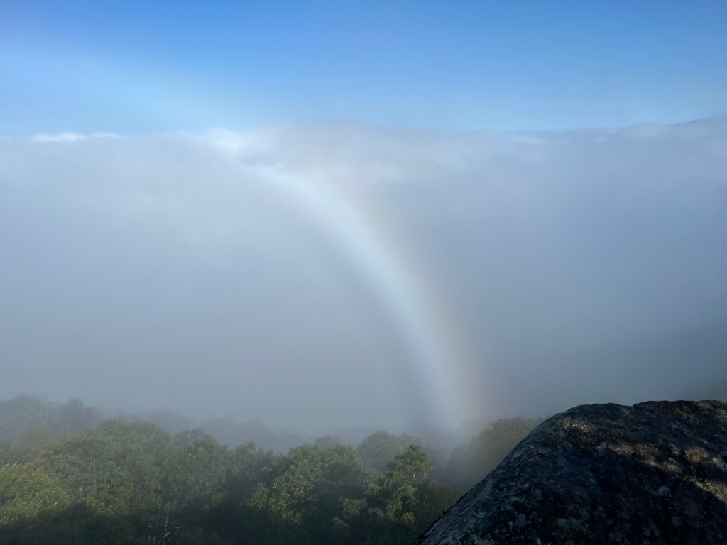 It was still pretty chilly and foggy, so the hike began with rain gear, rain covers on our packs and long pants. As we hiked along the ridge we came to an overlook in which we were above the clouds and a rainbow was sticking up out of the clouds!